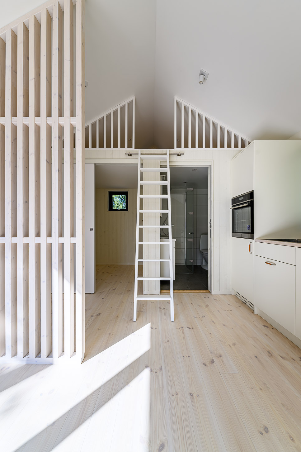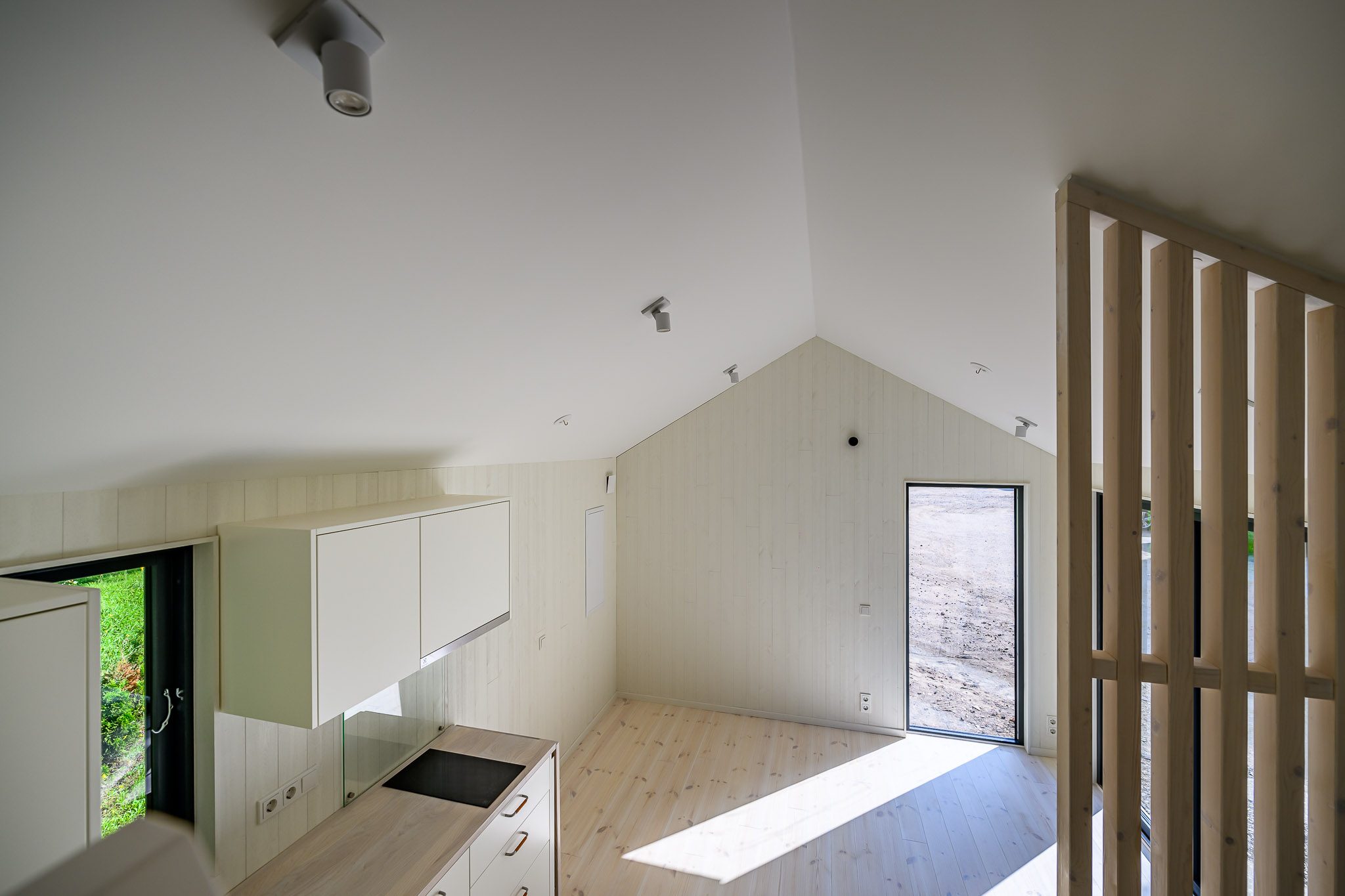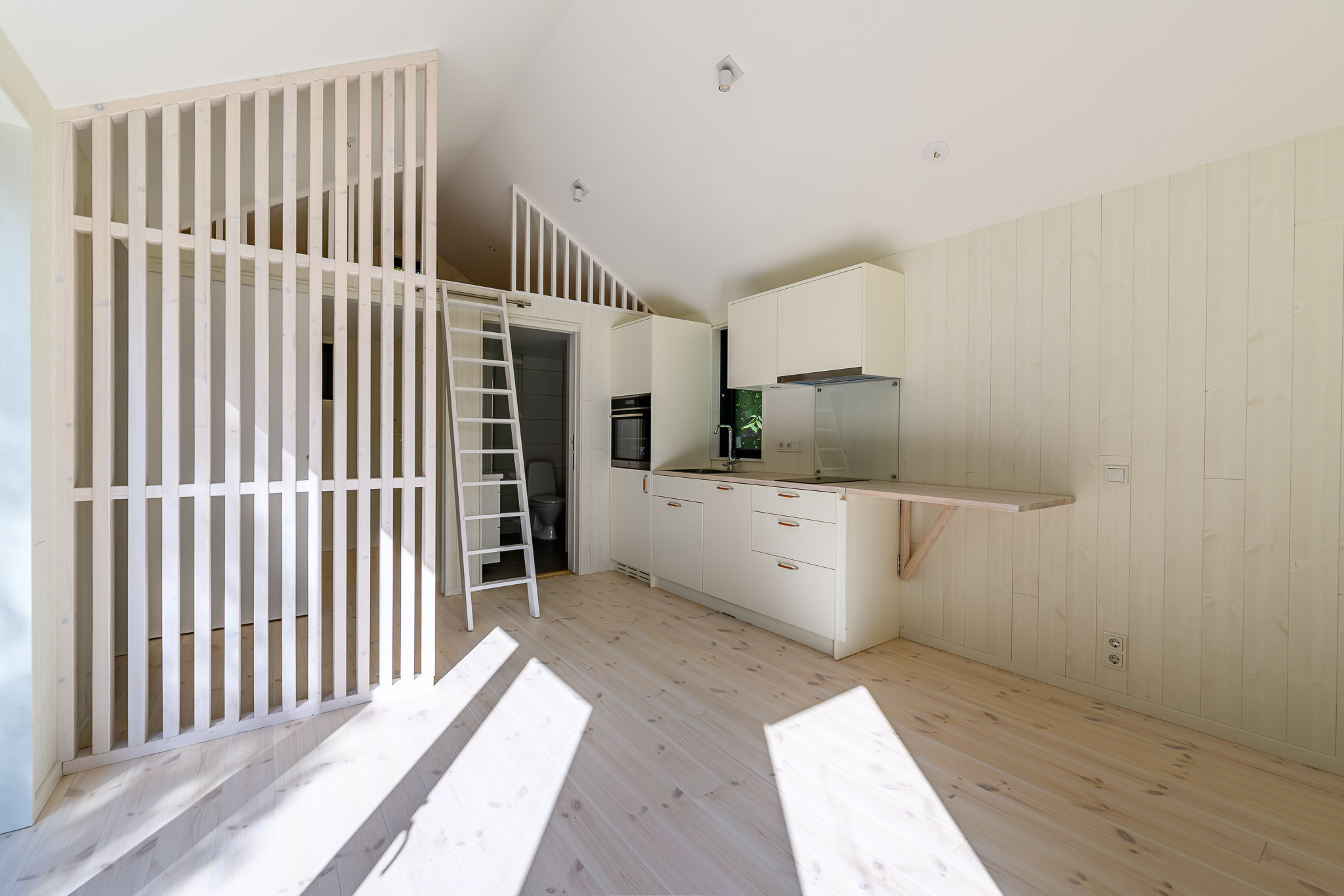 Huset har 30 kvm BTA med 7 kvm loft. Det är fullisolerat för åretruntbruk, utrustat med ljust trägolv och vitmålad träpanel på väggarna. Badrummet är helkaklat med klinkergolv, golvvärme samt duschväggar i glas. Köket är platsbyggt och målat i behaglig vit kulör samt utrustat med Electrolux köksapparater. Ett stort skjutdörrsfönster ger bra ljusinsläpp och enkel access till en möjlig framtida altan. Ytterpanelen är monterad stående (21x108mm) och helt färdigmålad med tjärvitriol från Auson