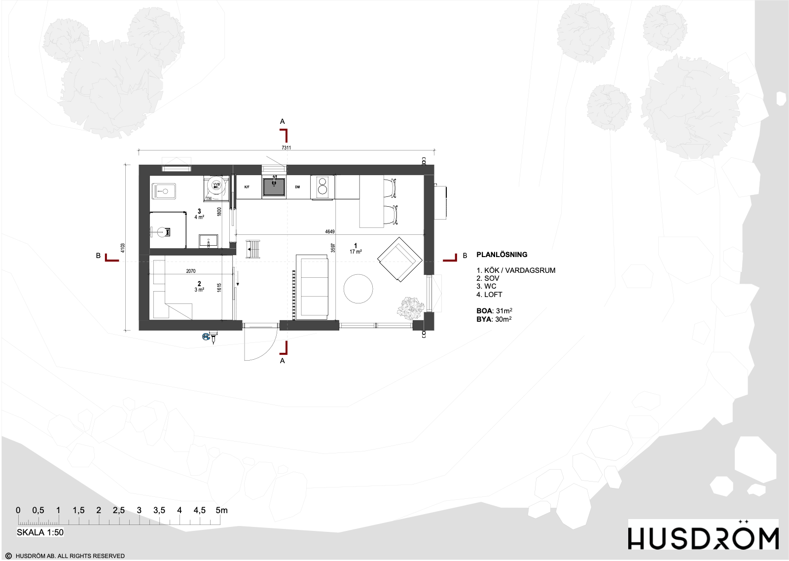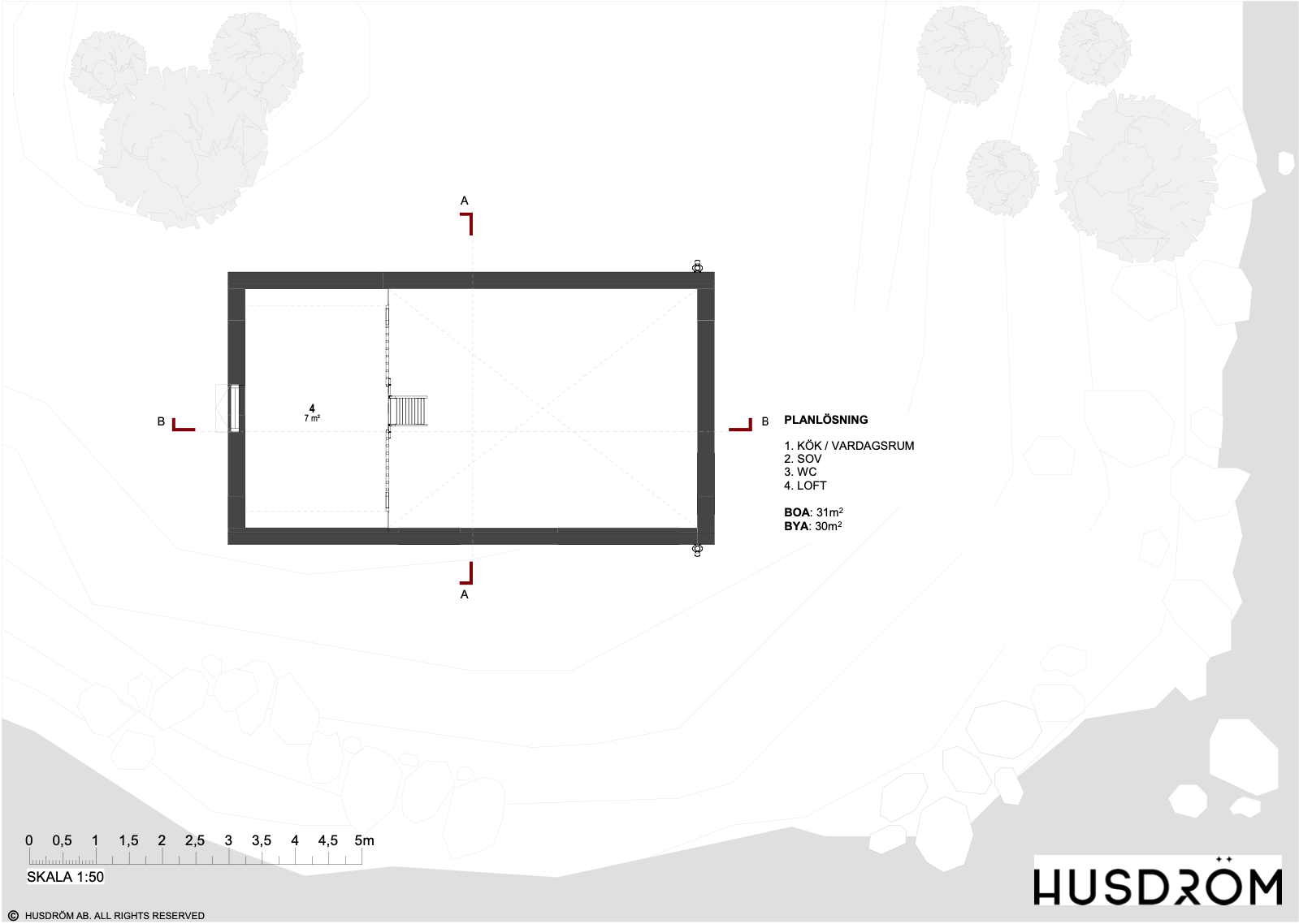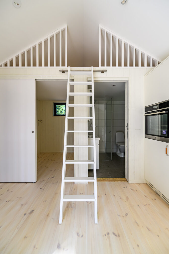 Huset har 30 kvm BTA med 7 kvm loft. Det är fullisolerat för åretruntbruk, utrustat med ljust trägolv och vitmålad träpanel på väggarna. Badrummet är helkaklat med klinkergolv, golvvärme samt duschväggar i glas. Köket är platsbyggt och målat i behaglig vit kulör samt utrustat med Electrolux köksapparater. Ett stort skjutdörrsfönster ger bra ljusinsläpp och enkel access till en möjlig framtida altan. Ytterpanelen är monterad stående (21x108mm) och helt färdigmålad med tjärvitriol från Auson