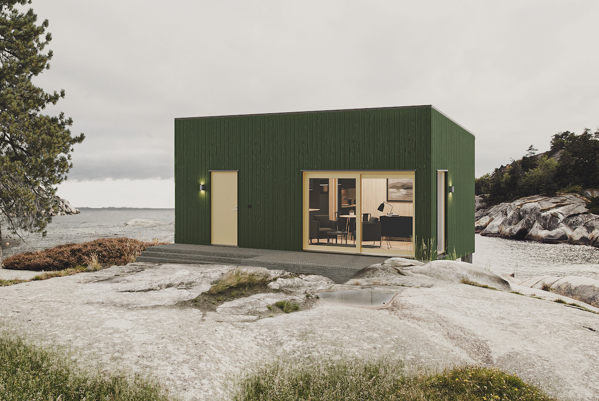 Utvändigt är samtliga hus i Drömserien klädda i färdigmålad stående panel, matchande plåtdetaljer samt låglutande pulpettak med papptak.